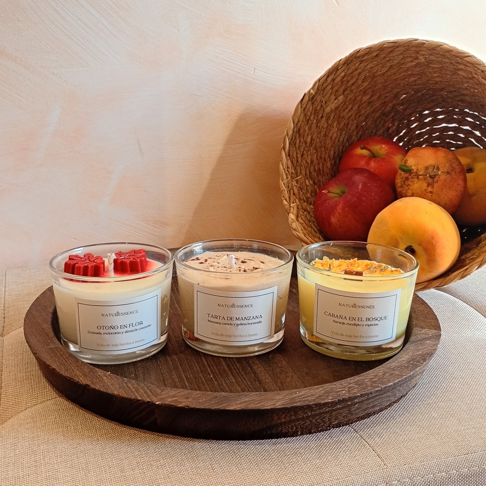 Pack de los tres aromas de otoño en tamaño vaso: Cabaña en el bosque (cítrico y especiado), Flor de otoño (afrutado) y Tarta de manzana (dulce).