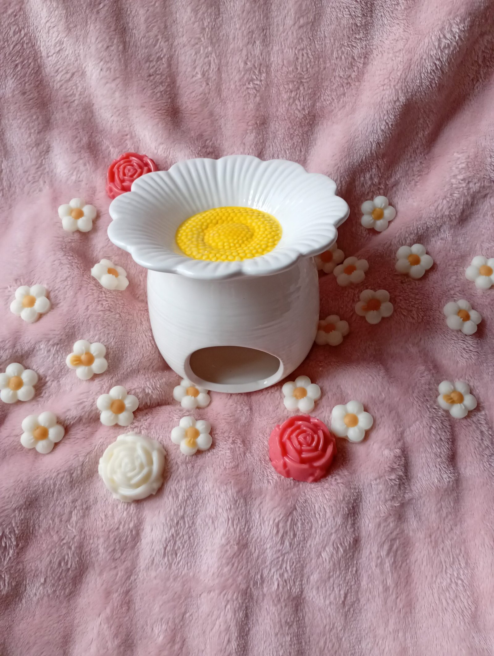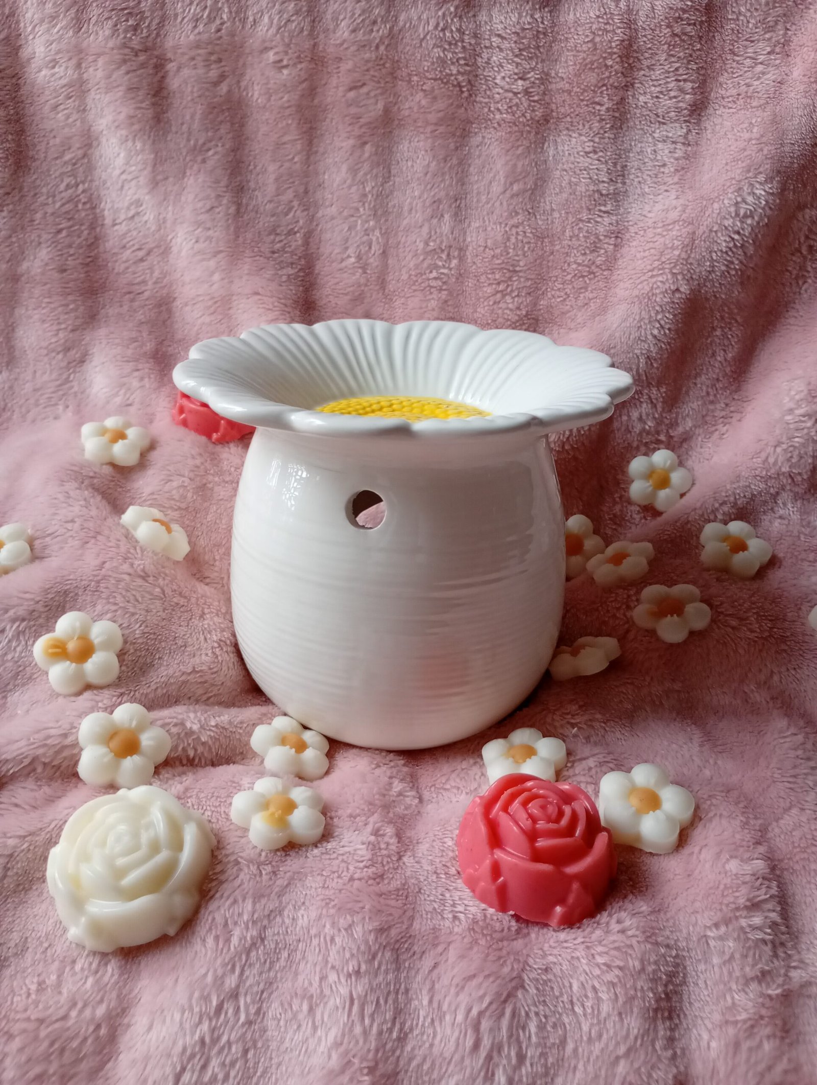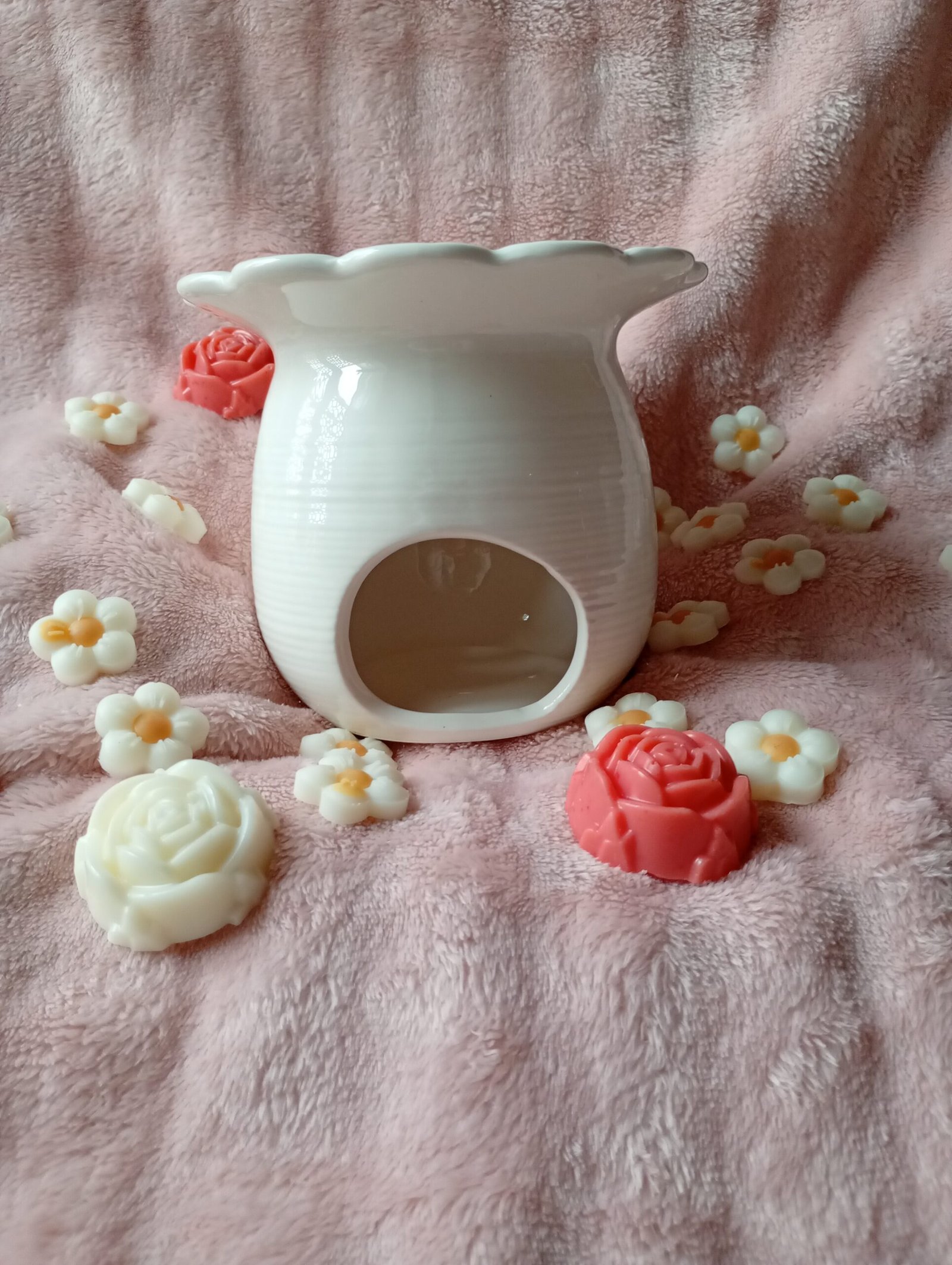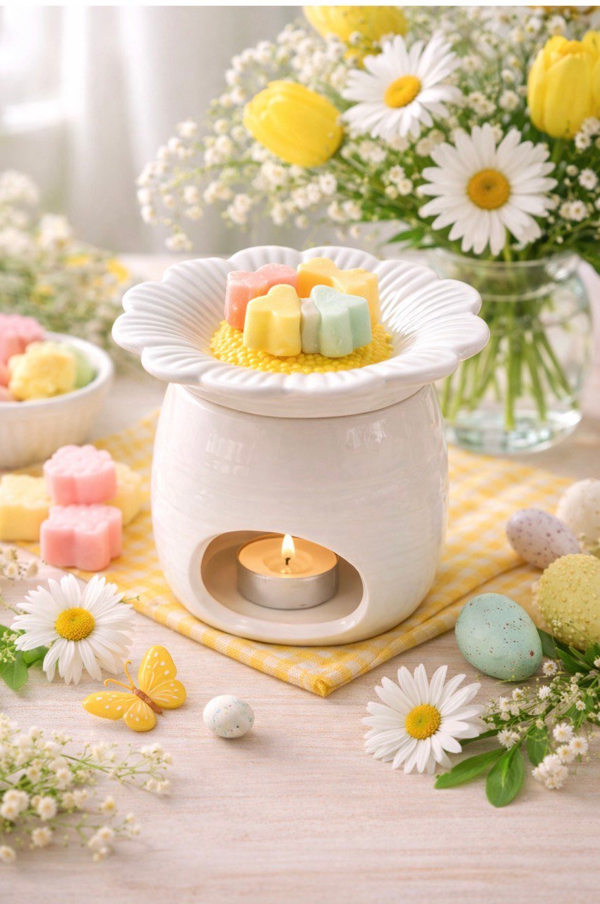 - Sitúa un trozo de cera perfumada (wax melt) en el cuenco superior del quemador. No añadas agua.